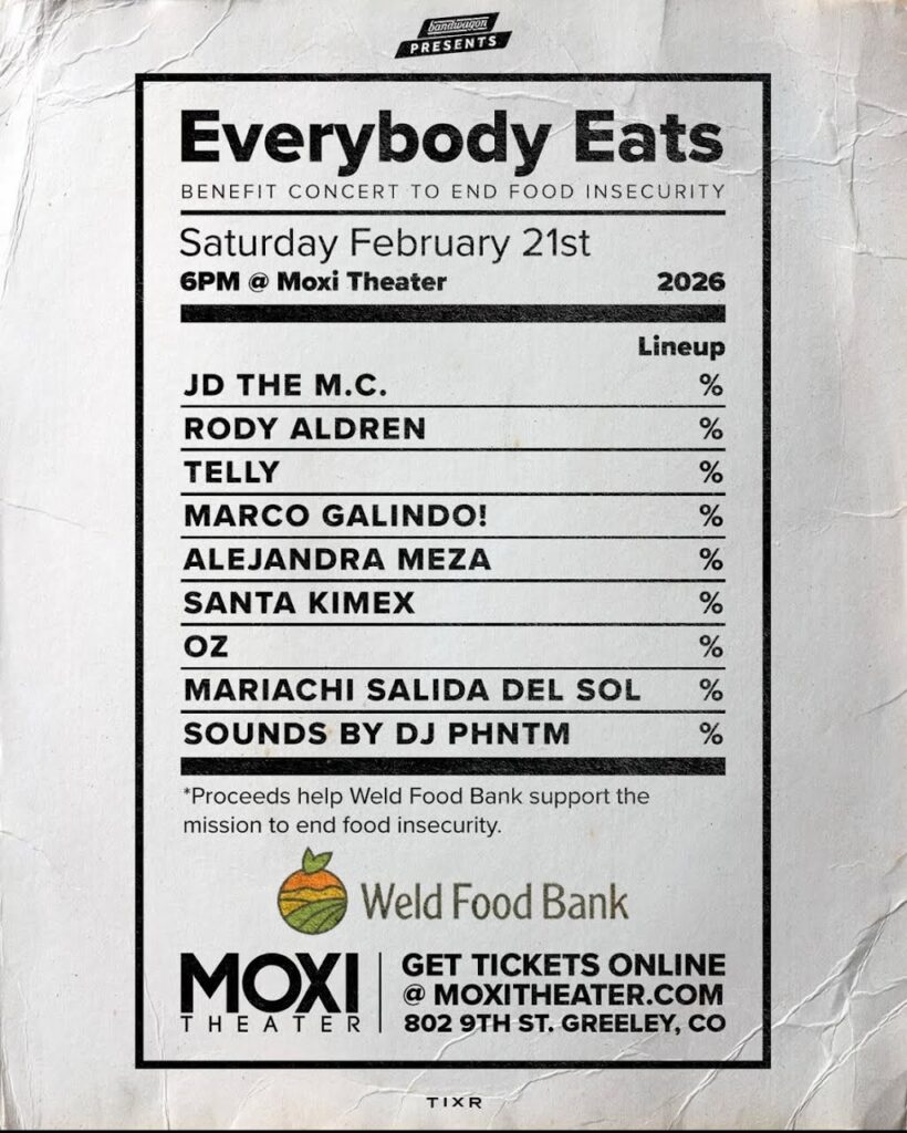 Todo el mundo come: Concierto benéfico para luchar contra la inseguridad alimentaria con el Banco de Alimentos de Weld con JD the M.C., Rody Aldren, Marco Galindo!, Mariachi Salida del Sol, Telly, Alejandra Meza, Santa Kimex, OZ & DJ PHNTM